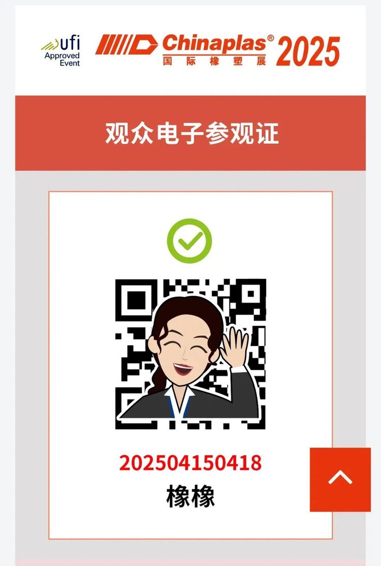 完成预登记后,电子参观证将以短信和电邮发送给您。您也可登录MyChinaplas账号或CHINAPLAS官方微信公众号获取电子参观证。电子参观证长这样↓