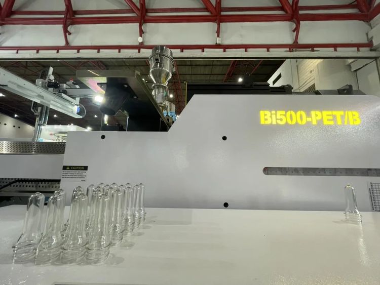 其中,以Bi500-PET/B为主体的瓶胚智能包装生产线,生产14克的瓶胚,一出64,每模仅需要12秒,获得客户的高度认可,市场需求火热。