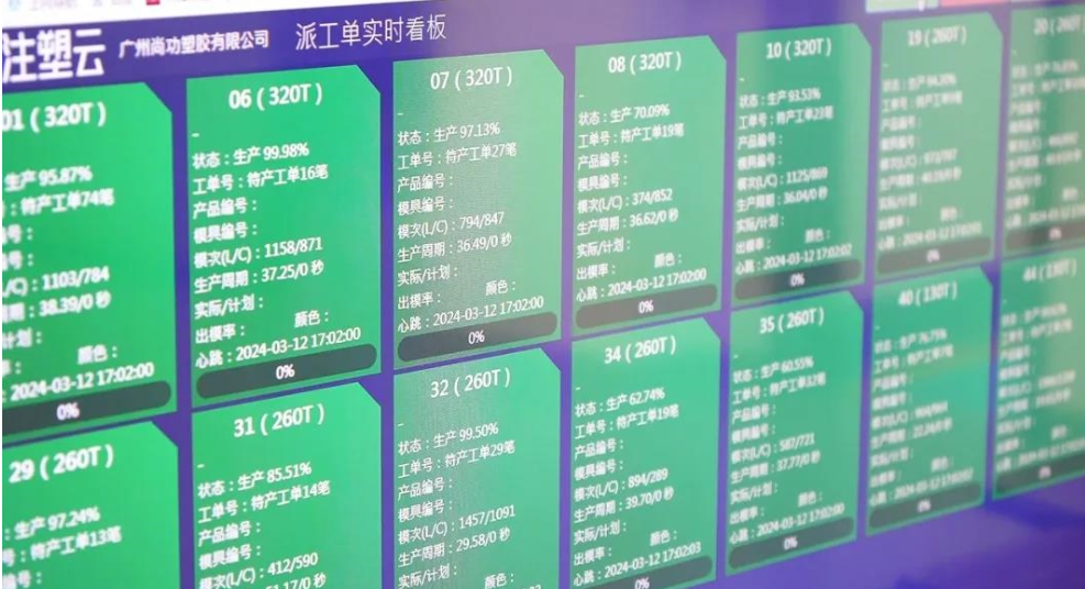 博创还为尚功提供软件系统服务,通过中和注塑云物联、生产管理系统MES和标识解析等产品创新应用,为尚功构建全面的数字化车间。该系统实现一物一码管理,能够实时监控设备状态和生产进度,使尚功的生产管理变得更加灵活高效。工厂管理者能够随时随地查看生产情况,异常信息和警告信息的主动推送将“人找事”转变为“事找人”,大幅减少异常等待和非计划停机时间。