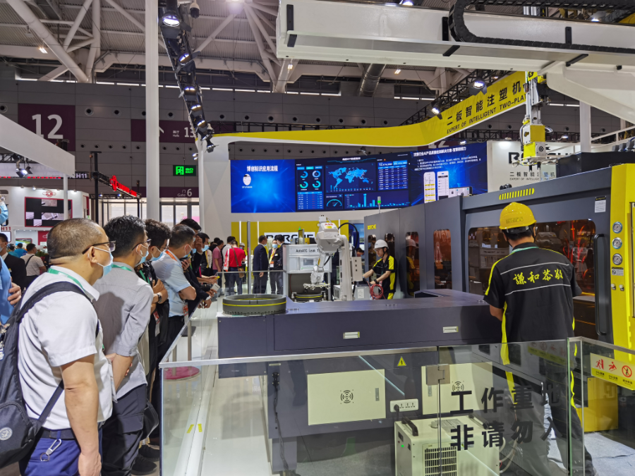 作为二板智能注塑机专家,博创在CHINAPlAS 2021上展示全新的、颠覆行业的洗衣机平衡环智能注塑生产系统。该系统以BM500-3C两板式水平对射三色机为主机集成多个自动化设备形成注塑岛。可以在人机交互界面(电脑)上实现注塑岛辅助设备(冷水机、模温机、机械手)的操作。进行注塑单元智能互联形成智能注塑无人化生产线实现多工序制品的注塑。机械手取件、CCD检测水口、切除水口、机器人搬运、气密性检测、码垛。